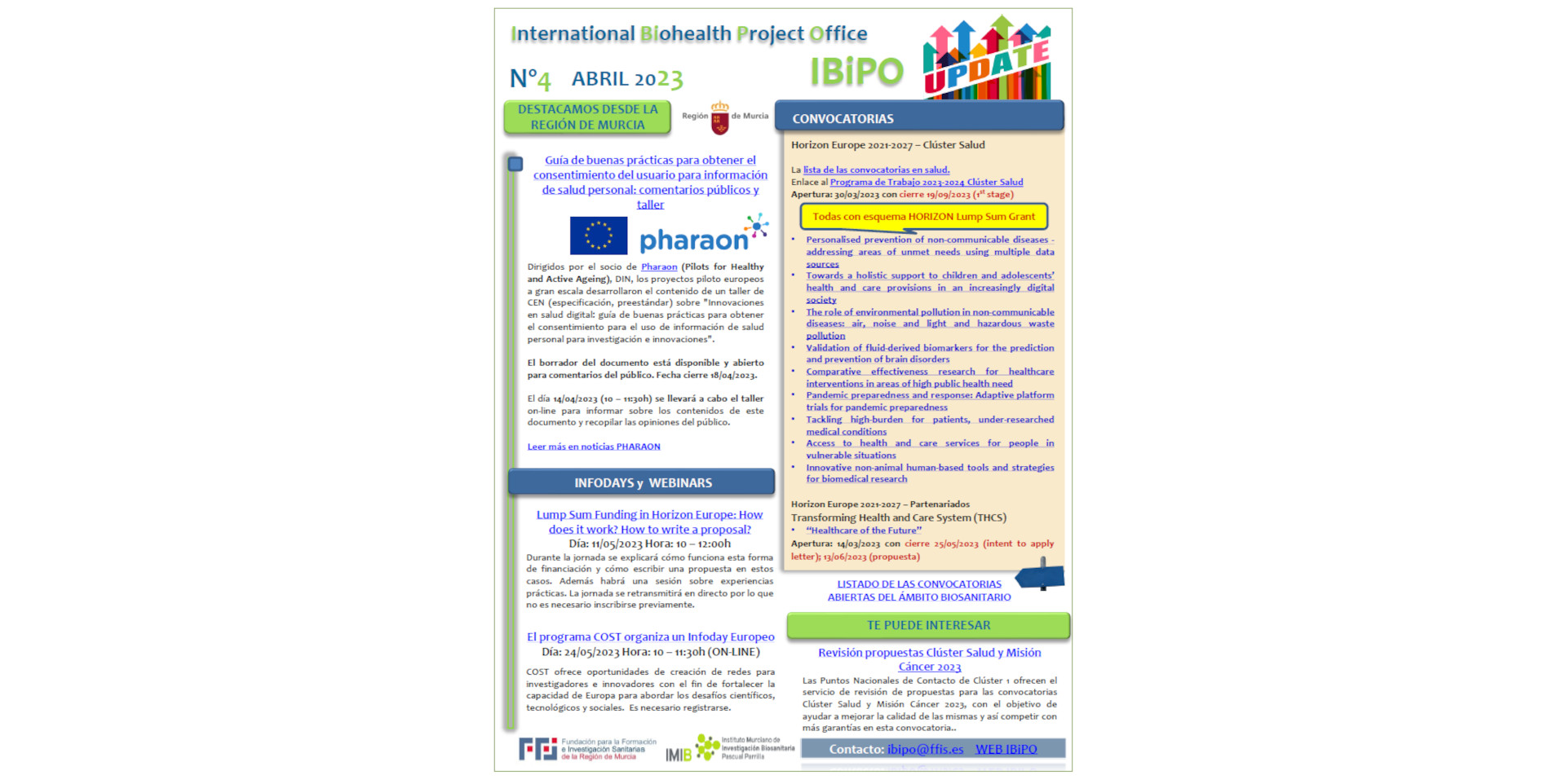 Volvemos desde la IBiPO con un nuevo boletín informativo que te trae las actualizaciones del ámbito internacional. Destacamos la apertura de nuevas convocatorias del Horizon Europe Clúster Salud 1 de ...