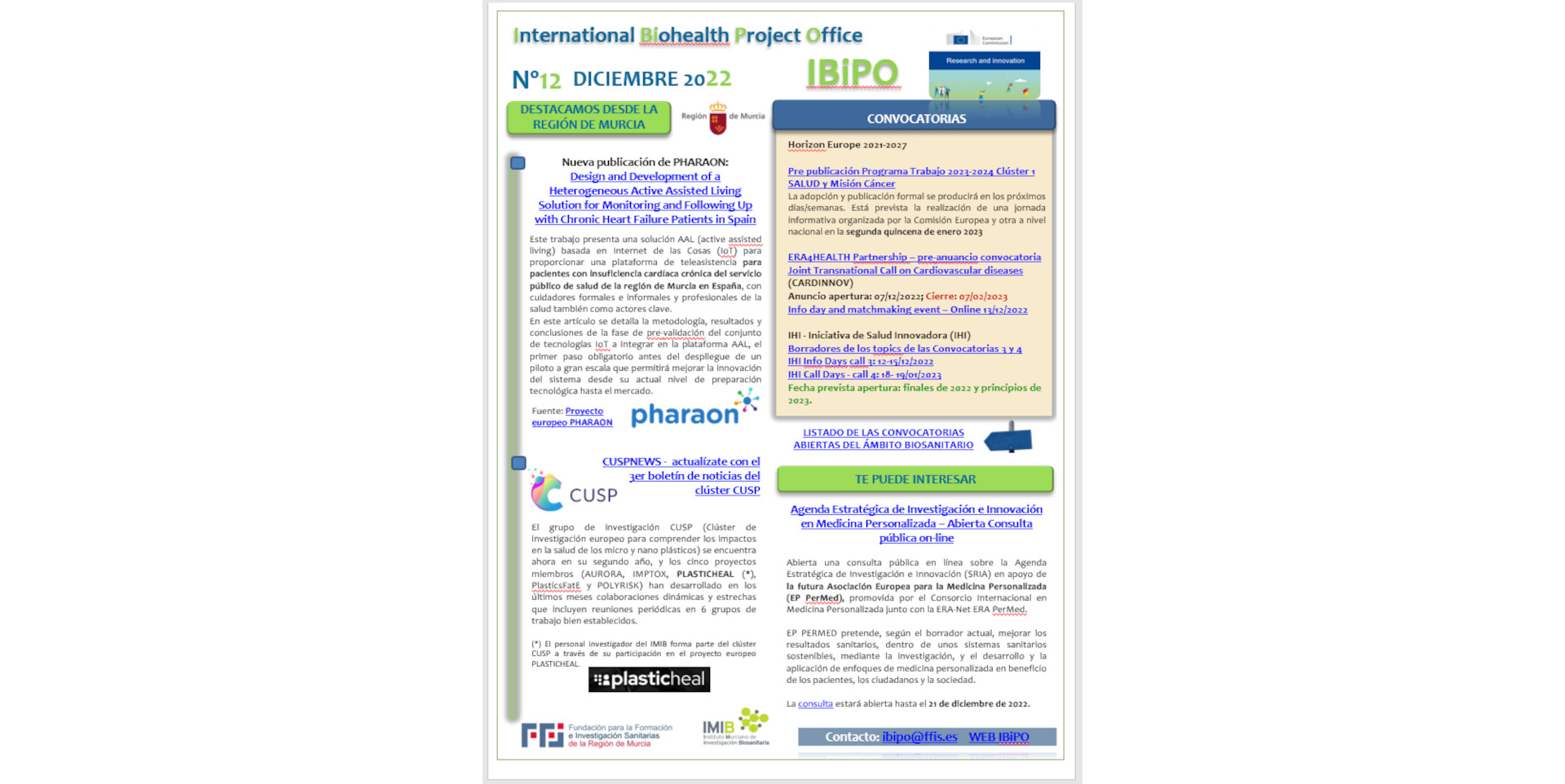 El boletín IBiPO te trae nuevas actualizaciones de la participación del Sistema Regional de Salud en los proyectos europeos. Destacamos también la pre-publicación del Programa de Trabajo 2023-2024 Clú...