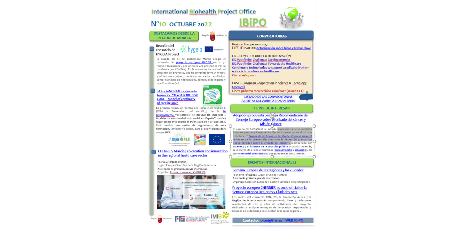 Como ya es habitual, el boletín IBiPO de este mes te trae actualizaciones de la participación del Sistema Regional de Salud en los proyectos y acciones conjuntas europeos. Destacamos la jornada de eva...