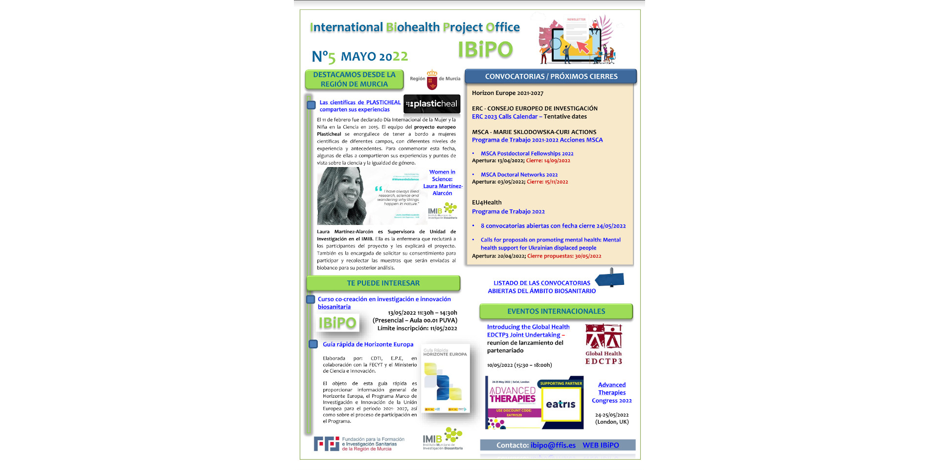 En este nuevo número del boletín IBiPO traemos el testimonio de Laura Martínez-Alarcón, la investigadora del IMIB que participa en el proyecto europeo PLASTICHEAL, que compartió su experiencia sobre l...