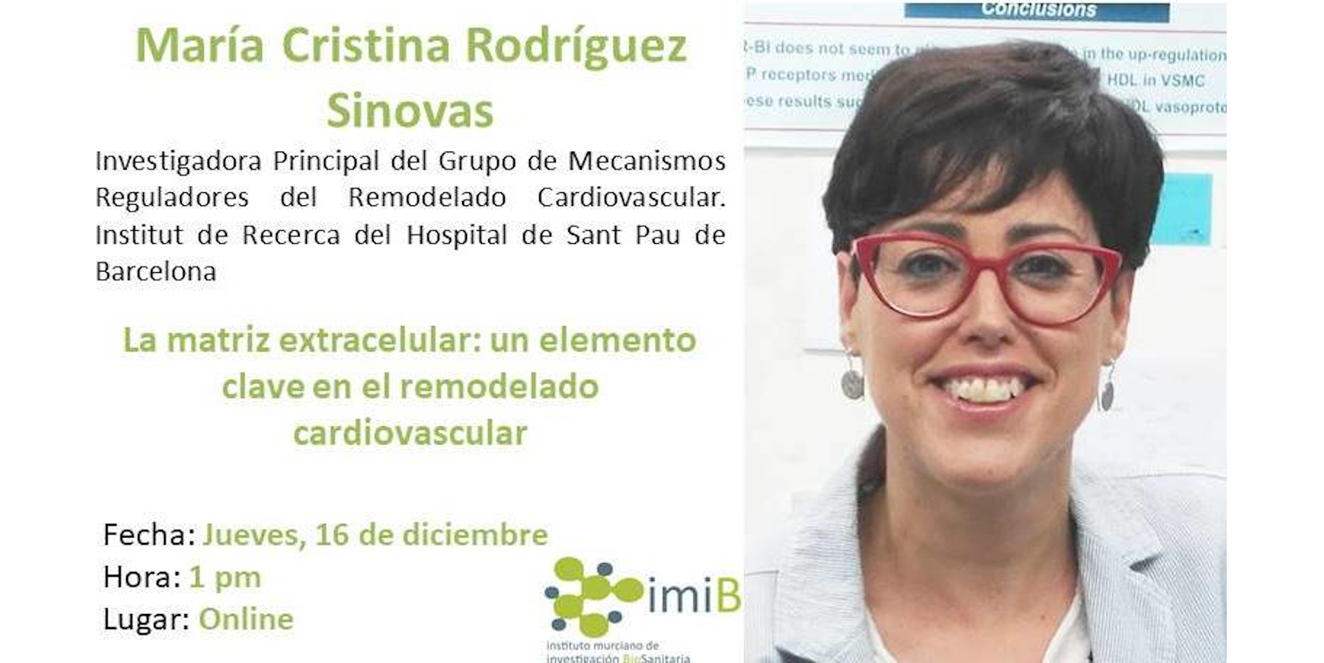 El jueves 16 de diciembre de 2021 a las 13h tendrá lugar el seminario IMIB titulado "La matriz extracelular: un elemento clave en el remodelado cardiovascular" impartido por la Dra. María Cristina Rod...