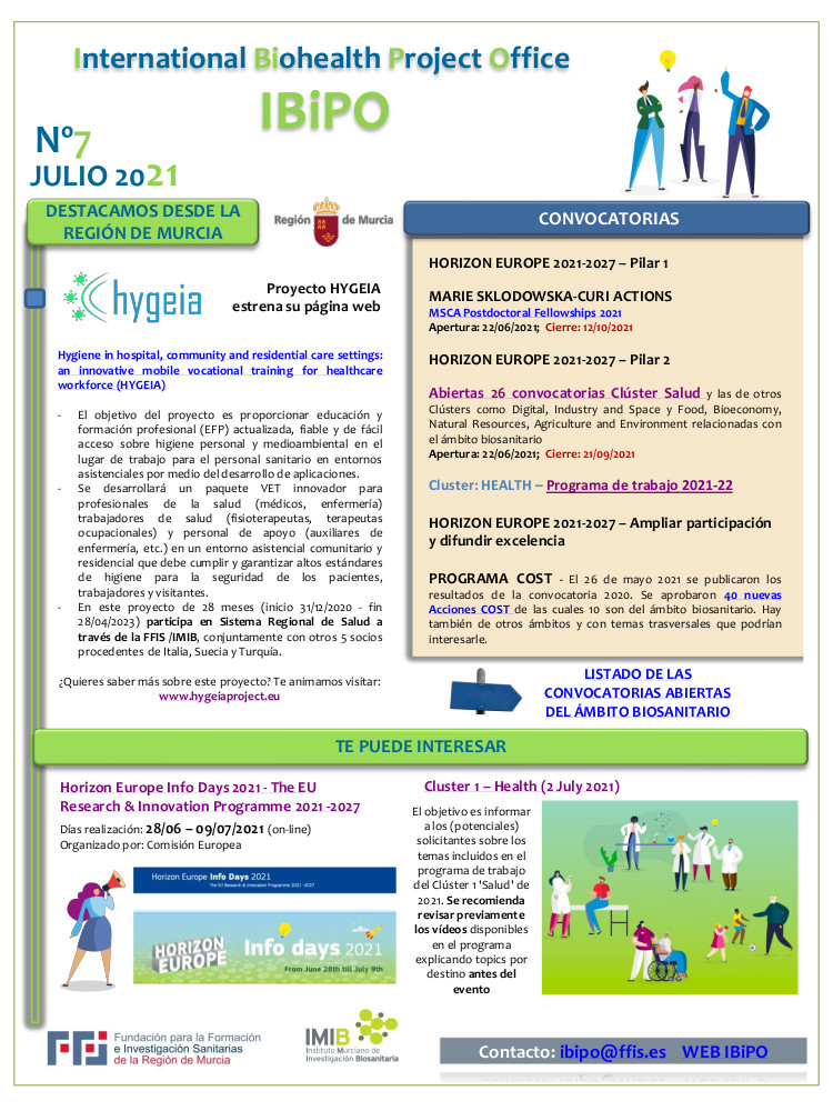 Destacamos la apertura de 26 convocatorias Horizonte Europa 2021 – 2027 del Clúster Health. Mañana, día 02/07/2021 organiza la Comisión Europea una Jornada Informativa abierta en formato online con mo...