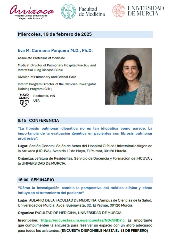 Estimados investigadores, el miércoles, 19 de febrero de 2025, tendrán lugar estos actos: 8:15 CONFERENCIA: “La fibrosis pulmonar idiopática no es tan idiopática como parece. La importancia de la eval...