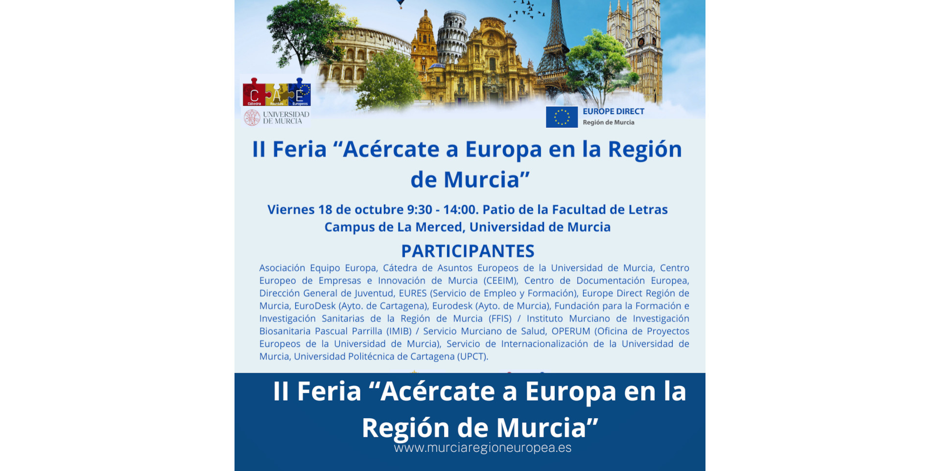 El próximo viernes 18 de octubre, la Universidad de Murcia será sede de la II Feria "Acércate a Europa en la Región de Murcia". La cita tendrá lugar de 9:30h a 14:00h en el Hemiciclo y patio de la Fac...