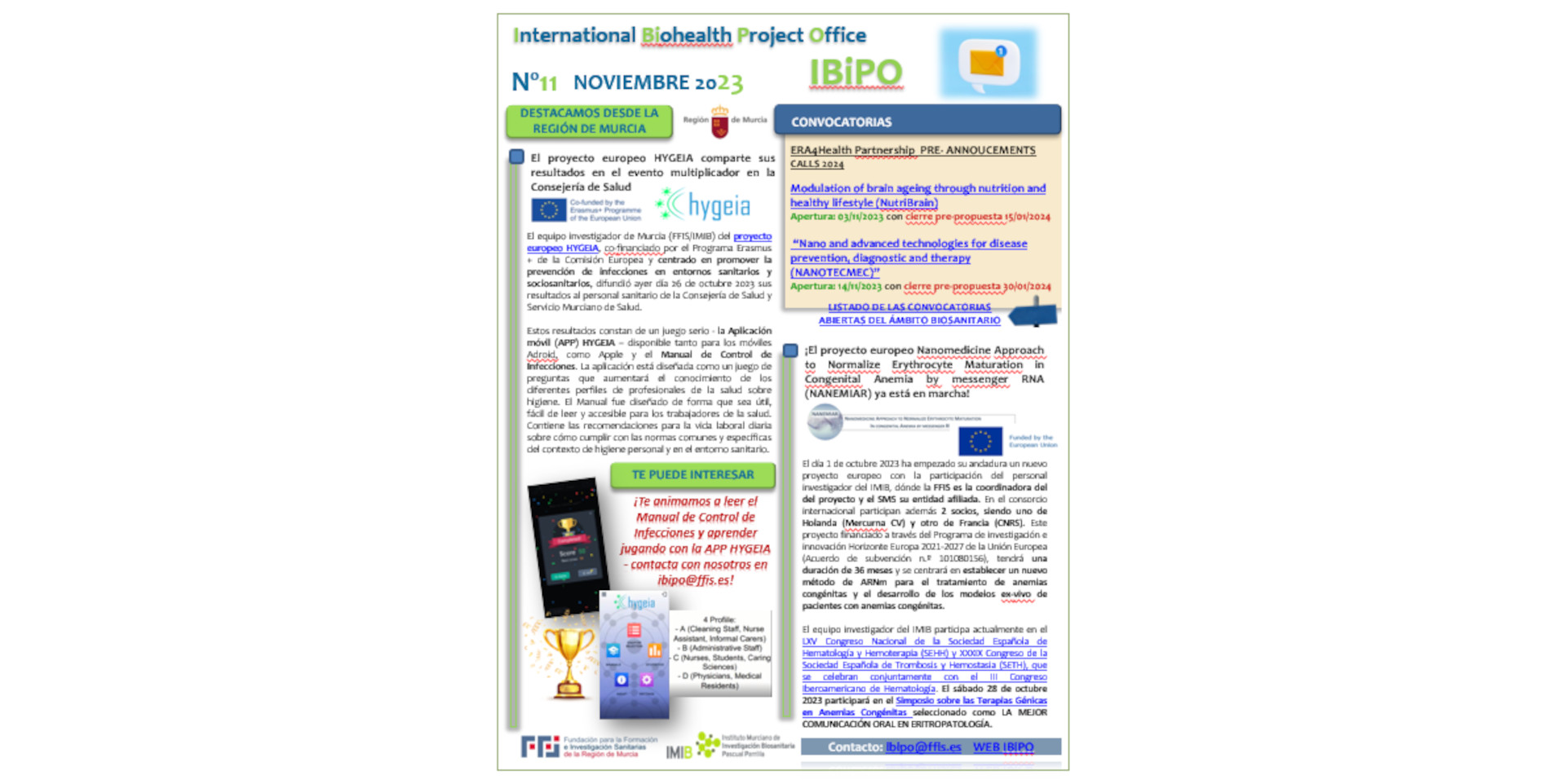 En el boletín de noticias de la IBiPO de este mes destacamos los resultados que ha logrado el proyecto europeo HYGEIA, centrado en promover la prevención de infecciones en entornos sanitarios y socios...