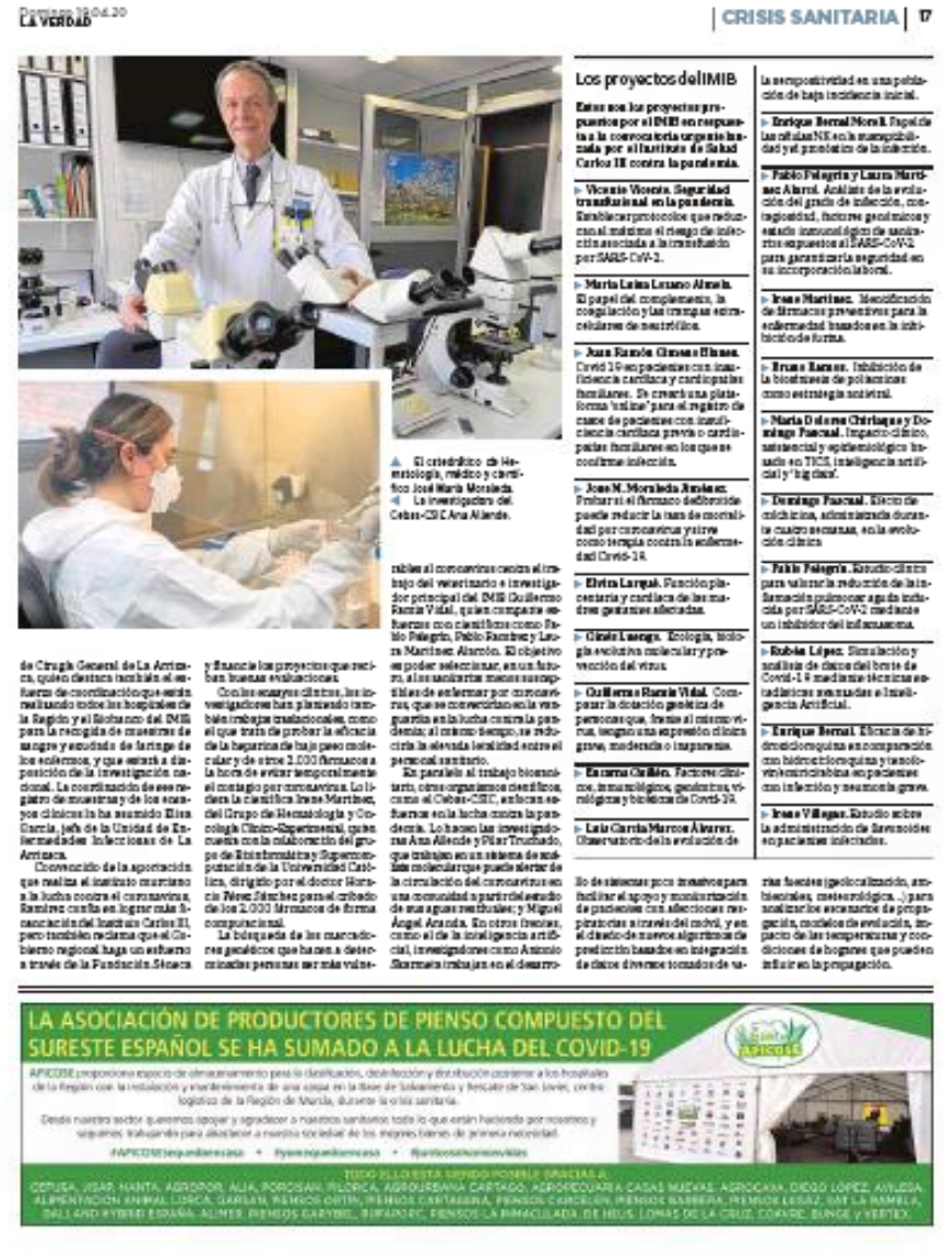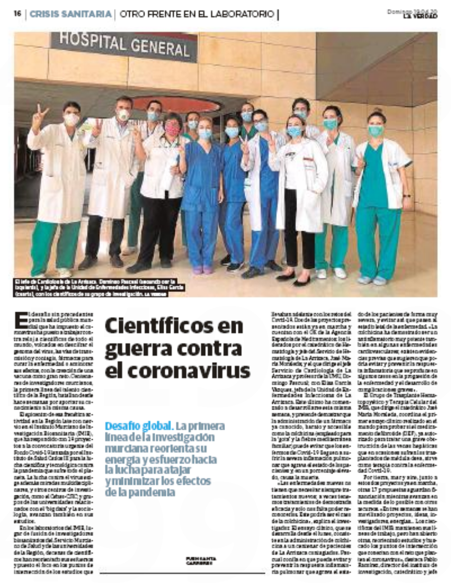 La Verdad lanza un reportaje en el que da a conocer los 19 proyectos solicitados por el Instituto Murciano de Investigación Biosanitaria en la convocatoria urgente lanzada por el Instituto de Salud Carlos III para estudiar el COVID-19. Dos de los proyectos presentados están ya en marcha y cuentan con el aprobado de la Agencia Española de Medicamentos. Son los liderados por el catedrático de Hematología y jefe del Servicio de Hematología de La Arrixaca, José María Moraleda; y el que dirige el jefe Servicio de Cardiología de La Arrixaca y profesor de la UMU, Domingo Pascual; con Elisa García Vázquez, jefa de la Unidad de Enfermedades Infecciosas de La Arrixaca. Este último ha comenzado a desarrollarse esta misma semana, y pretende demostrar que la administración de un fármaco ya conocido, barato y accesible como la colchicina (empleado para la 'gota' y la fiebre mediterránea familiar) puede evitar que los enfermos de Covid-19 lleguen a sufrir la severa inflamación pulmonar que agrava el estado de los pacientes y, en un porcentaje elevado, causa la muerte.