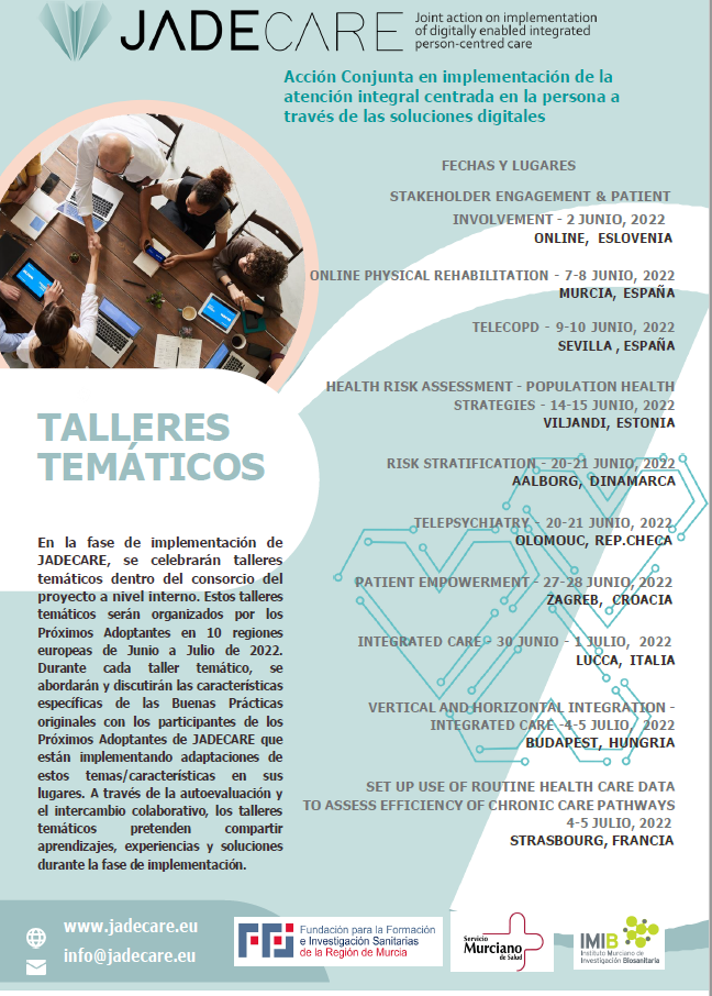 En la fase de implementación de JADECARE (Acción Conjunta en implementación de la atención integral centrada en la persona a través de las soluciones digitales), se celebrarán talleres temáticos dentro del consorcio del proyecto a nivel interno. Estos talleres temáticos serán organizados por los Próximos Adoptantes en 10 regiones europeas de junio a julio de 2022.