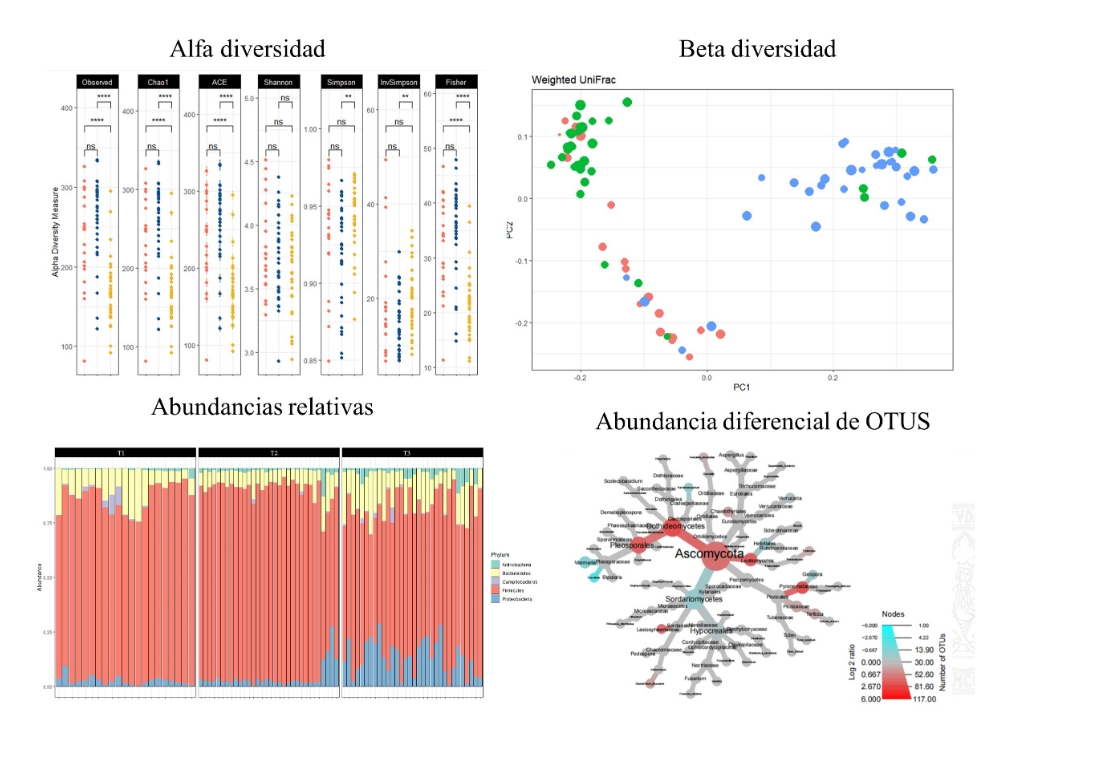 Recientemente, se ha dado un paso muy importante en este ámbito de actuación con la implementación de los análisis secundarios en metagenómica. Nuestro análisis bioinformático incluye tanto el de las regiones variables 16S (bacterias) como ITS (hongos), generando informes muy completos que pueden incluir: