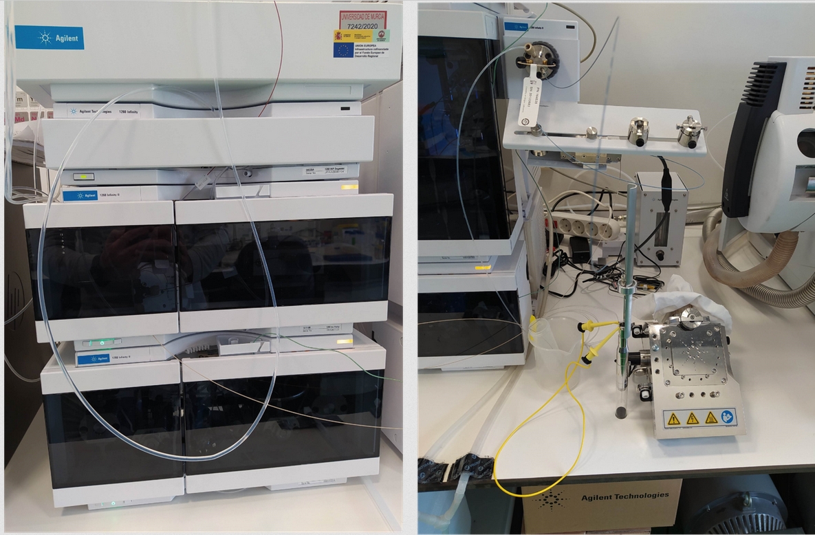 Este equipamiento fue adquirido en la convocatoria FEDER 2019 y se instaló a finales de 2020. Está compuesto por una bomba binaria de alta resolución Agilent 1290 Infinity Series II, una bomba isocrática de alta resolución Agilent 1260, una válvula de intercambio rápido de flujo y una fuente de ionización tipo nano-electrospray (Nano-ESI, G1992A). Esta configuración permite alcanzar la mayor sensibilidad analítica en el sistema LC-MS, aumentando en más de 10 veces la de algunos compuestos respecto a la configuración estándar. Está especialmente indicada para ensayos de proteómica (llegando en algunos casos al nivel de nanogramos de proteína identificada) donde con frecuencia nos encontramos con muestras muy escasas o con concentración de proteína muy baja. Las principales características de este sistema son: