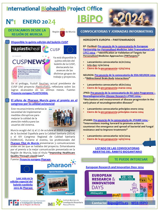 Volvemos con la nueva edición del boletín de noticias de la IBiPO. En primer lugar, ¡deseamos a todos los lectores un FELIZ AÑO 2024! Destacamos el premio a la mejor comunicación presentada en la Región de Murcia por el personal investigador del Piloto Pharaon en Murcia, bajo el título “Improving Healthcare Quality Through Liquid Care”. Este reconocimiento enfatiza la necesidad de implementar medidas disruptivas para mejorar la calidad de la atención médica para los usuarios del sistema. A principios del año 2024 abrirán las convocatorias de los partenariados europeos que podrían ser de tu interés. En el boletín encontrarás enlaces a los respectivos pre-anuncios. Seguimos dándote un valor añadido con la información actualizada en la segunda parte del boletín – en este número traemos el detalle de financiación del Programa de Trabajo EU4Health 2024. Más información en el boletín.