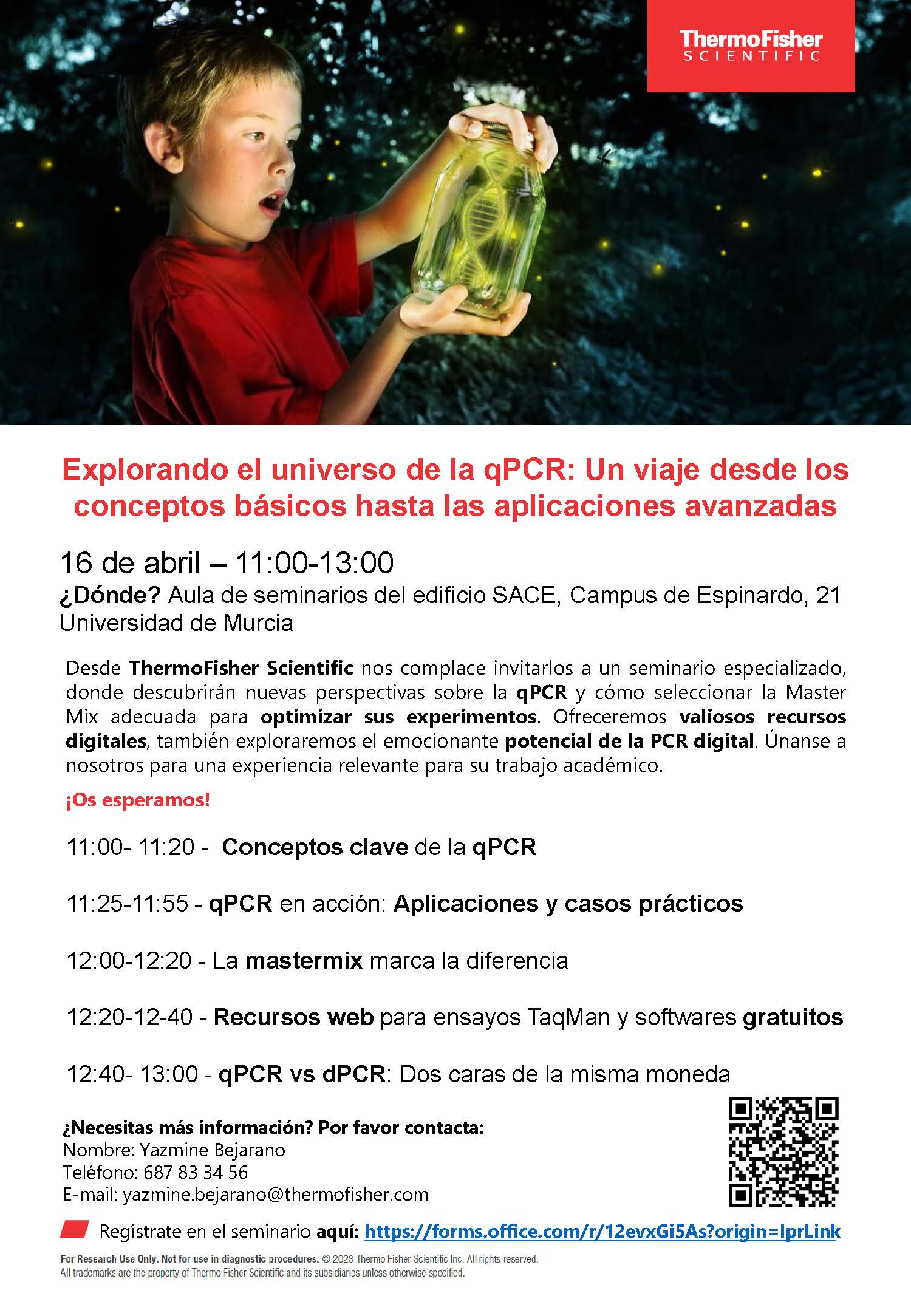 La empresa ThermoFisher Scientific -en colaboración con la Plataforma de Biología Molecular del Área Científica y Técnica de Investigación (ACTI) de la Universidad de Murcia- ha organizado un seminario titulado “Explorando el universo de la qPCR: un viaje desde los conceptos básicos hasta las aplicaciones avanzadas”, que se impartirá el próximo 16 de abril de 11:00 a 13:00 h en el aula de seminarios del edificio SACE, Campus de Espinardo.