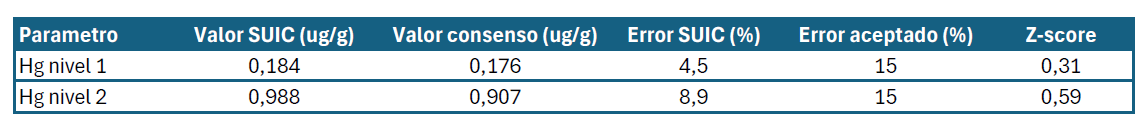Los resultados obtenidos en este ejercicio han sido muy positivos. Las desviaciones estándar de nuestros análisis resultaron por debajo de las aceptadas en el ejercicio para ambas muestras. Además, el parámetro estadístico z-score, que debe ser inferior a 2 para considerar los resultados como satisfactorios, presentó valores de 0,59 y 0,31 para las muestras analizadas.