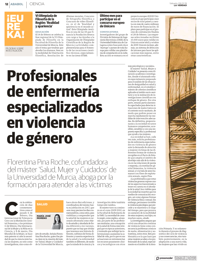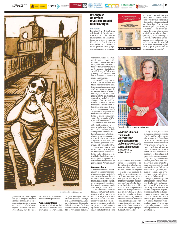 Coincidiendo que el pasado 6 de febrero se celebraba el Día Internacional de Tolerancia Cero con la Mutilación Genital Femenina; el 11 de febrero, el Día Internacional de la Mujer y la Niña en la Ciencia; y que se acerca el 8 de marzo, Día Mundial de la Mujer, el suplemento científico Ababol ha entrevistado a Florentina Pina, investigadora del IMIB, sobre el papel que tiene la enfermería en la violencia de género.