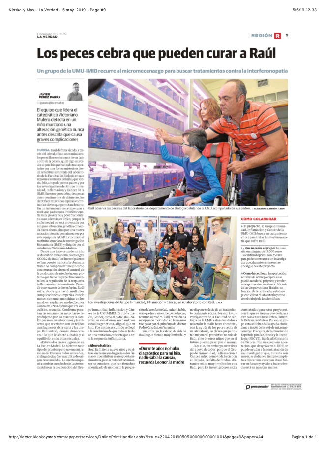 El diario La Verdad publica este fin de semana el caso de Raúl, un murciano de nueve años con una alteración genética nunca antes descrita. El grupo Inmunidad, Inflamación y Cáncer está tratando de buscar una cura para mejorar su calidad de vida. A través de la plataforma de micromecenazgo Precipita, de la Fundación Española para la Ciencia y la Tecnología (FECYT), intentan recabar fondos que permitan contratar un investigador que, durante seis meses, se dedique a tiempo completo a dar con un tratamiento eficaz para Raúl.