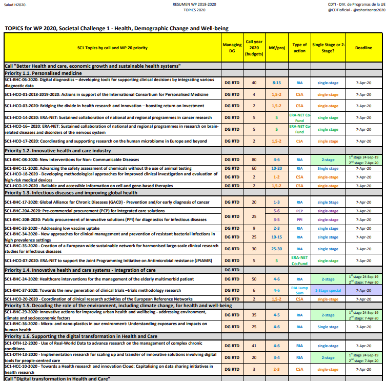 Informamos de la PUBLICACIÓN del Programa de trabajo 2018-2020 que incluye los topics correspondientes al 2020 del Reto 1, Salud, Cambio Demográfico y Bienestar del Horizonte 2020 (http://ec.europa.eu/research/participants/data/ref/h2020/wp/2018-2020/main/h2020-wp1820-health_en.pdf) así como el resto de Programas de Trabajo y anexos al mismo (https://ec.europa.eu/info/funding-tenders/opportunities/portal/screen/how-to-participate/reference-documents) .